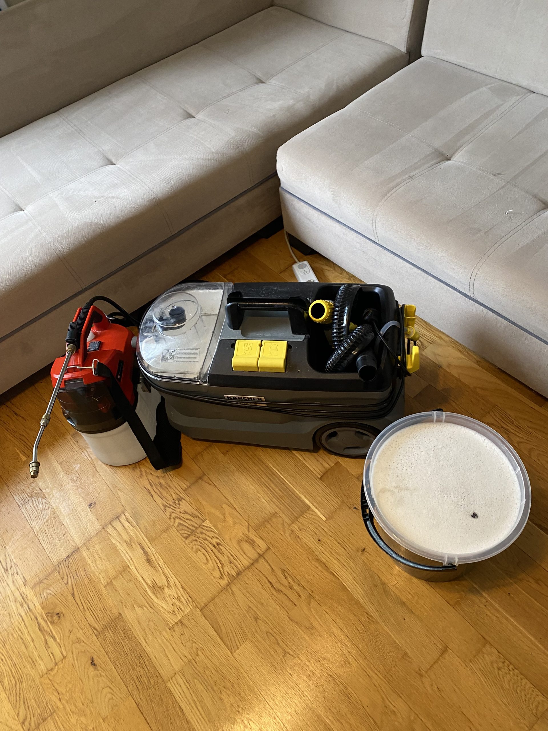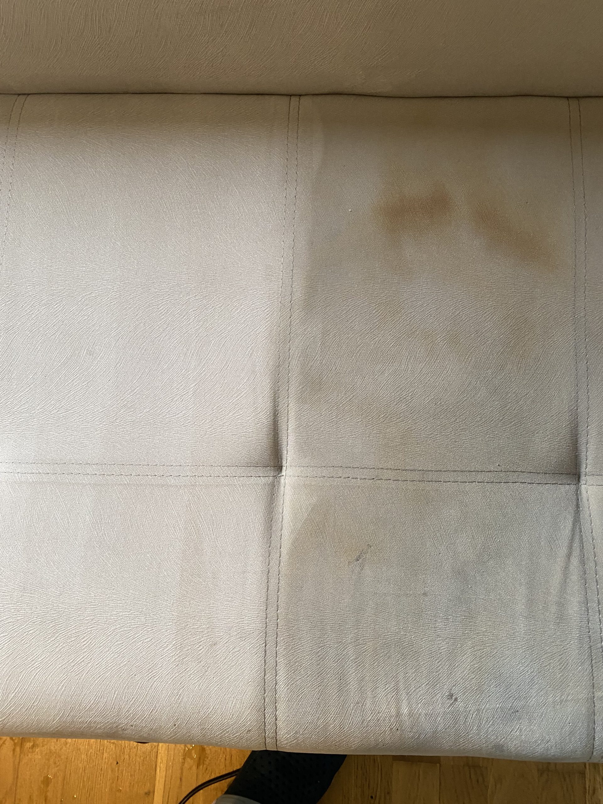 Özel şampuan ve profesyonel ekipmanlarla yapılan işlem sonucunda, kahve lekeleri tamamen çıkarıldı ve koltuk eski canlı rengine kavuştu.